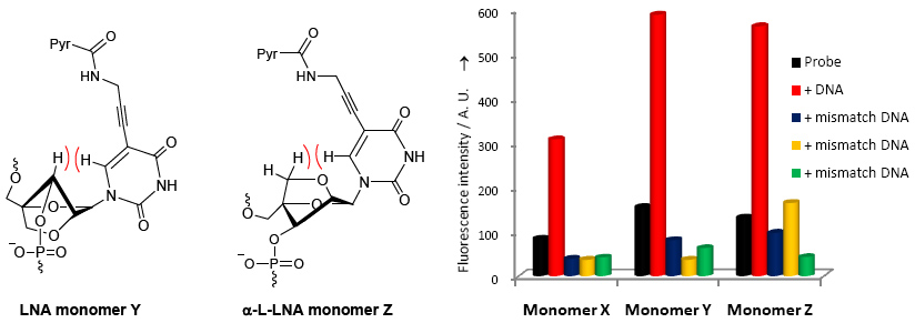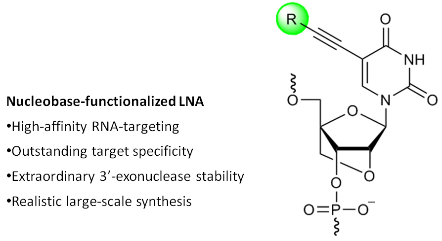 RNA-targeting oligonucleotides (e.g., antisense, siRNA, and anti-miR) are widely explored as fundamental research tools and are gaining increasing promise as therapeutic agents against diseases of genetic origin. Introduction of chemically modified nucleotides into oligos is essential to increase their binding affinity toward RNA targets, improve discrimination of mismatched RNA to reduce off-target effects, and enhance stability against nucleases to slow down degradation. Among the many chemistries that have been evaluated in the past two decades, phosphorothioate DNA (PS-DNA), O2’-alkylated RNA and affinity- and specifity-enhancing Locked Nucleic Acid (LNA) have emerged as the most therapeutically interesting modifications. The FDA approved the cholesterol-lowering antisense drug Mipomersen in January 2013. ~40 antisense drug candidates currently are evaluated in clinical trials. We are developing new nucleotide building blocks such as nucleobase-modified LNA monomers that display promising hybridization and diagnostic properties (e.g., see publication 46)